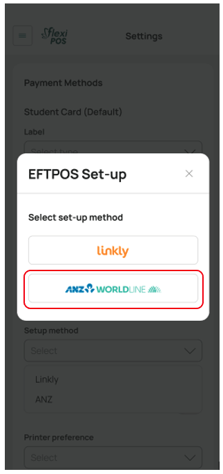 4. You'll be prompted to select an EFTPOS provider - choose ANZ Worldline