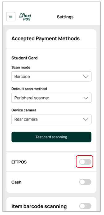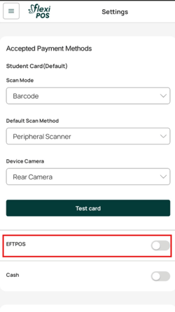 - On the Settings page, enable the EFTPOS option by switching the toggle on