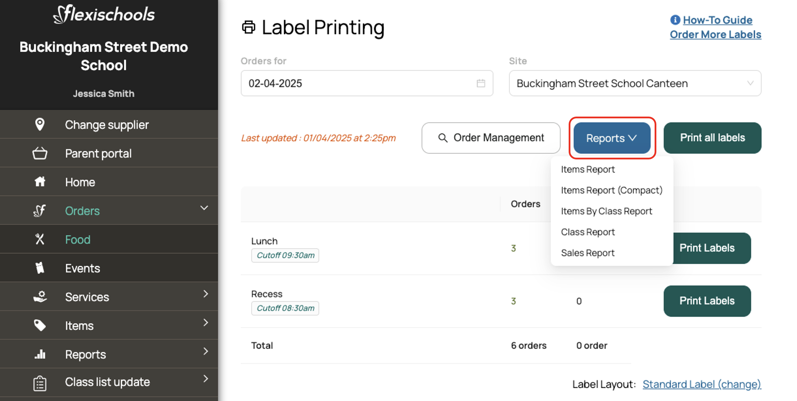 - Class report: Lists orders placed split by class, services, and if applicable, site. This report includes the label number, order ID, customer name and order details.