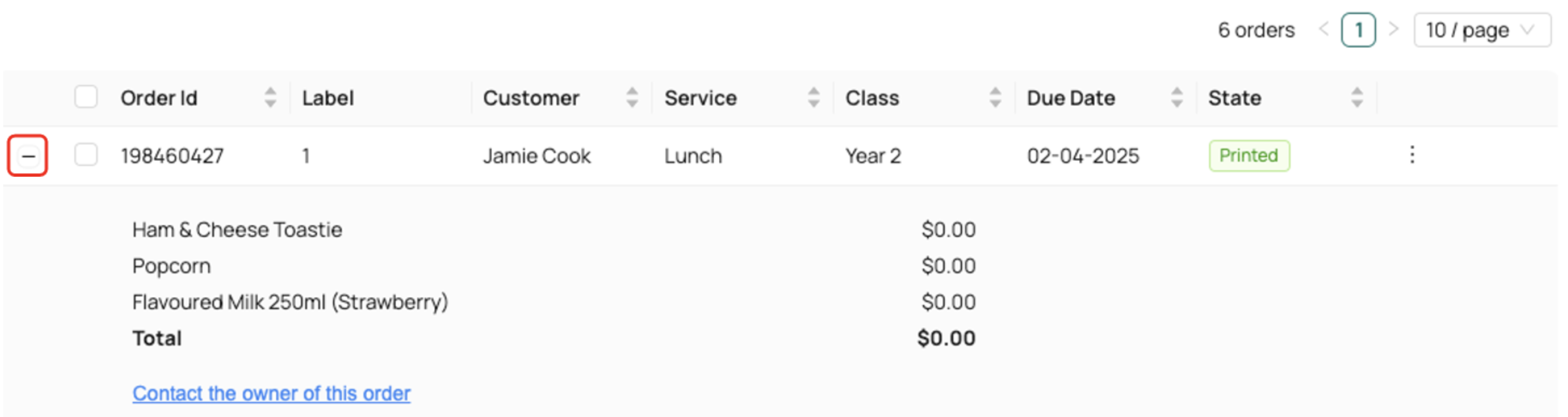 - To view an order in more detail, including the orderer's contact information, click on the + icon to expand.
