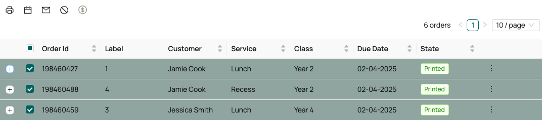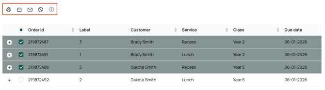 For additional actions on multiple orders, use the boxes on the left to select multiple orders, or the box at the top to select all orders on the screen. You’ll see some icons appear at the top of the grid with various actions you can perform on orders:
