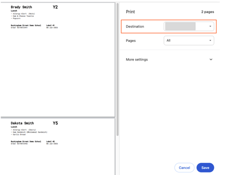 - The print preview screen will appear. Ensure your label printer is selected as the printer destination, then click 'Print'.