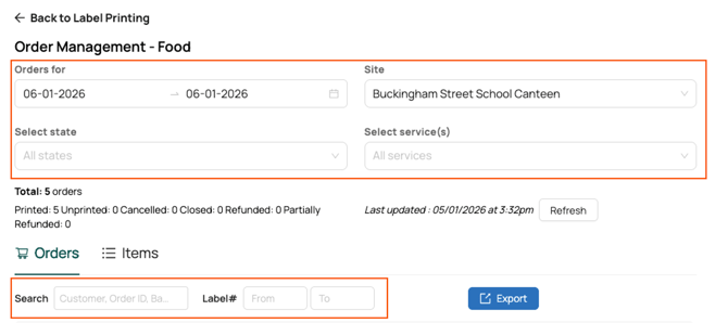 Filter orders by date range, site, order state, service or label number.