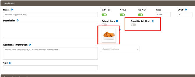 Note: if you would like the price of your item to change depending on the options selected, we will do that in the 'options' section. - If you like, you can enter a SKU (stock keeping unit) to keep track of your inventory and assist in selling items through Flexipos when linked with your item, if you have a scanner. This won't be visible to parents. Then add food icons like 'vegetarian' and 'homemade', which will show to parents.