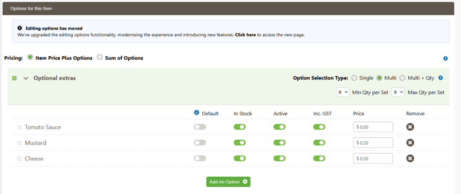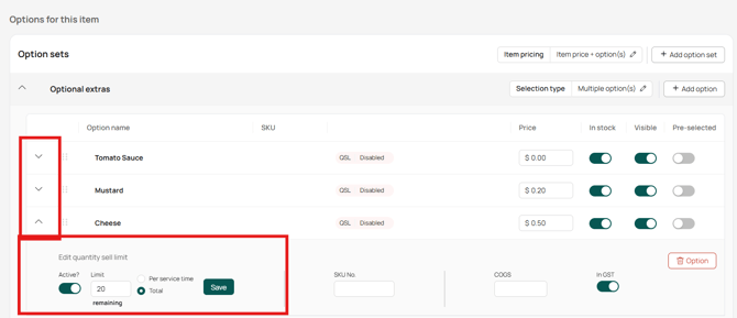 This new interface allows you to manage Quantity Sell Limits (QSL) and stock settings for each individual option you’ve created. E.g. you can limit the cheese option to be 20 available but allow unlimited purchases for sauce.