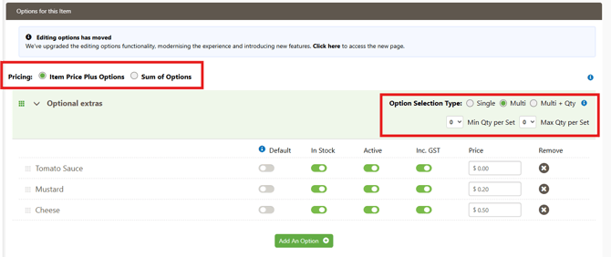 Each option has a In stock toggle, Active/Visible toggle, Inc. GST toggle, Option-specific price and Remove option button