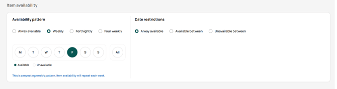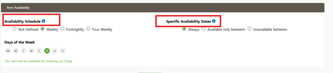 The Item Availability section allows you to control when a food item can be ordered. This ensures that weekly meal specials, or limited‑availability products only appear for parents on the days you intend them to be offered.