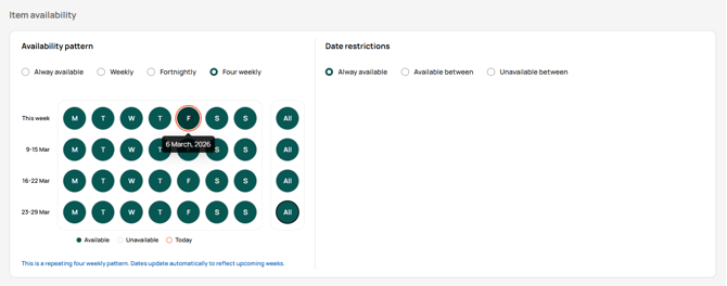 1. Availability Schedule This setting determines the repeating pattern (or cycle) for when the item is available.You can choose from: