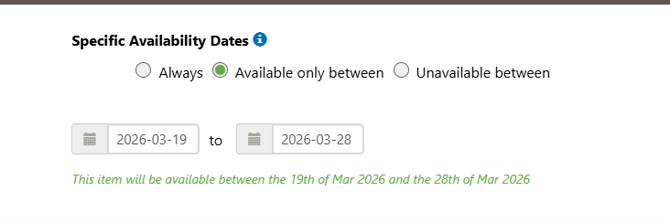 2. Specific Availability DatesThis section allows you to limit the item to a particular date range or exclude it during certain dates.