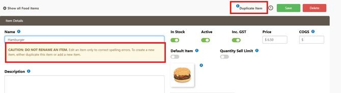 Avoid renaming an existing item unless you are correcting a small spelling error. Renaming can affect your reports, order history, stock tracking, and any linked food services. If you're introducing a new menu item—such as replacing Hamburger with Cheeseburger—it's best to duplicate the item or create a new one from scratch. This keeps your menu data accurate and prevents confusion.