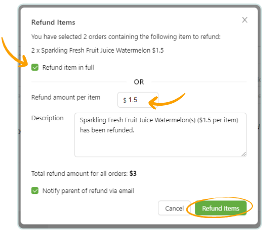 Refund item in full: This will refund the full item price (e.g. you run out of chocolate milk, and need to refund the entire item)