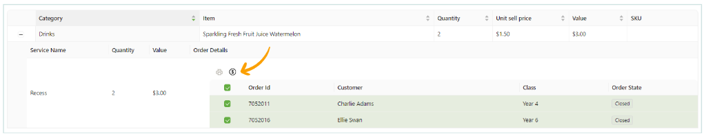 - Select the orders that you would like to refund and click the refund icon.