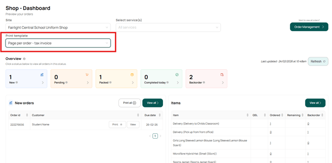 By default, orders will be printed into a tax invoice format. You can change this template at the top of the page under the 'Print template' field, to print onto labels or A4 labels (10 labels per A4 page)