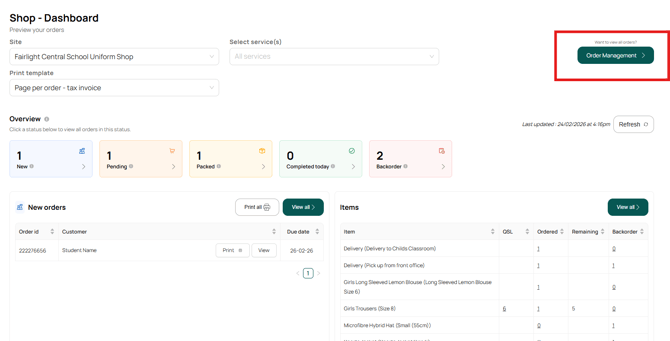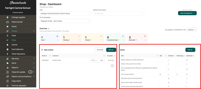 This page provides an overview of New orders as well as a summary of items in orders that haven't been marked as 'completed'.