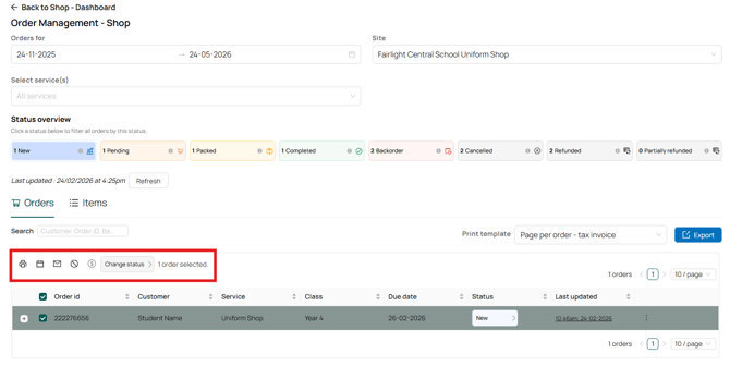 For additional actions, use the boxes on the left to select one or multiple orders, or the box at the top to select all orders on the screen. You’ll see some icons appear at the top of the grid with various actions you can perform on orders: