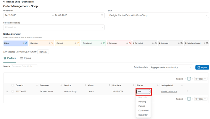 To change the status of an order, click on the status button and choose which it should be moved to.